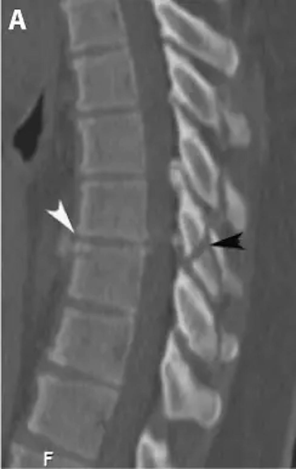 A) پری آپریٹو سیگیٹل سی ٹی اسکین چھاتی کی ریڑھ کی ہڈی کے فریکچر کی نقل مکانی کو ظاہر کرتا ہے۔ ڈسک کی جگہ میں خلل پڑتا ہے (سفید تیر کا نشان) اور پہلو کے جوڑ ٹوٹ گئے ہیں (سیاہ تیر کا نشان)۔
