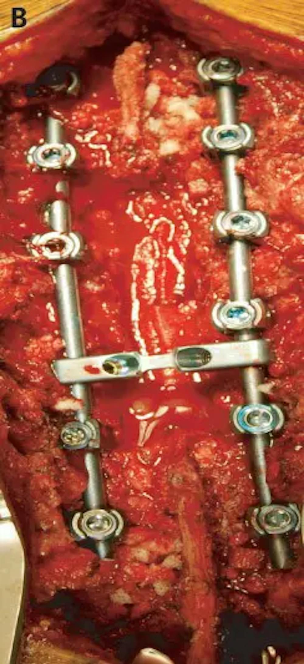 ب) انٹرا آپریٹو تصویر چھاتی کی ریڑھ کی ہڈی کو مستحکم کرنے کے لیے استعمال ہونے والے چھاتی کے پیڈیکل پیچ اور سلاخوں کا مظاہرہ کرتی ہے۔