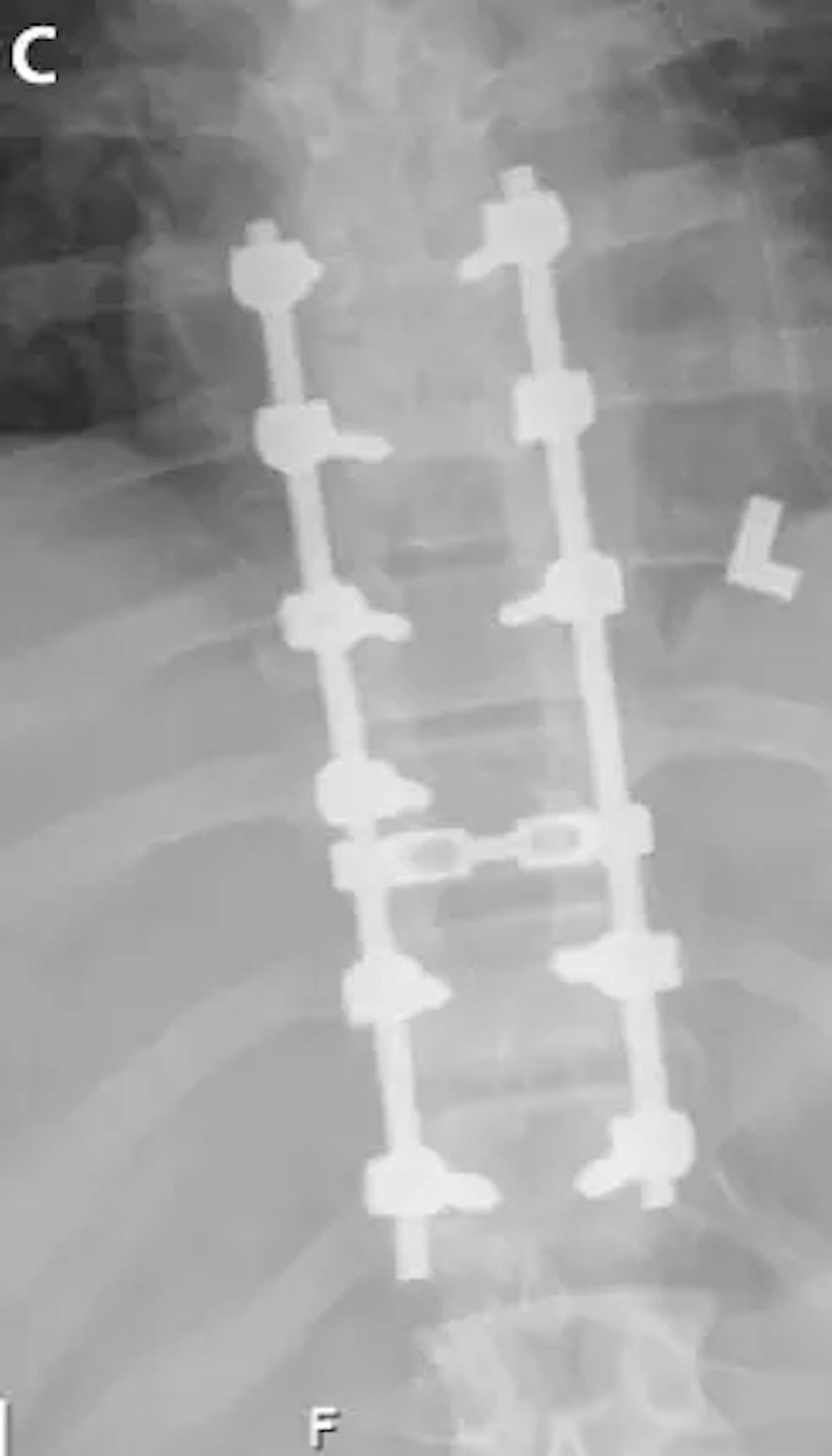 C) پوسٹ آپریٹو اے پی ایکس رے چھاتی کے پیڈیکل پیچ اور سلاخوں کا مظاہرہ کرتا ہے۔