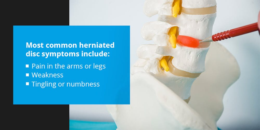 હર્નિએટેડ ડિસ્કના લક્ષણો ગંભીરતા અને ઇજાગ્રસ્ત ડિસ્ક ક્યાં સ્થિત છે તેના આધારે બદલાય છે. પીડા વિના હર્નિએટેડ ડિસ્ક હોવું પણ શક્ય છે કારણ કે બધી હર્નિએટેડ ડિસ્ક નોંધપાત્ર લક્ષણોનું કારણ નથી. હર્નિએટેડ ડિસ્કના કેટલાક સામાન્ય લક્ષણોમાં નીચેનાનો સમાવેશ થાય છે: