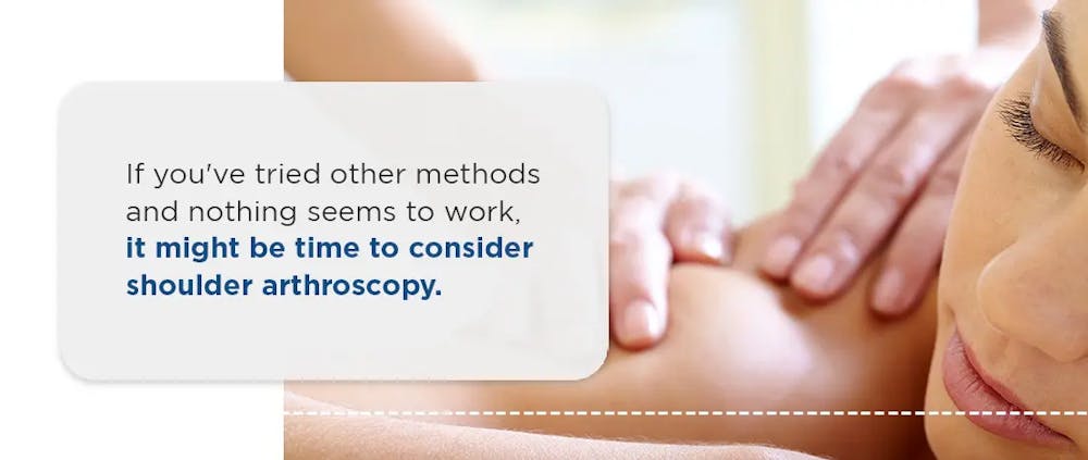 일부 회전근개 손상은 물리 치료, 휴식, 스테로이드와 같은 약물로 치료할 수 있습니다. 어깨를 치료하기 위해 다른 방법을 시도해 보았지만 효과가 없는 것 같다면 어깨 관절경을 고려해야 할 때입니다.