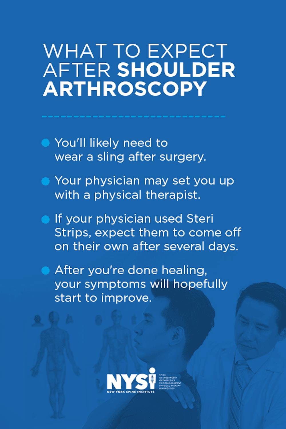 전체 수술이 완료되면 의사는 절개 부위를 봉합하고 붕대로 덮을 것입니다. 의식이 깨어나고 의식이 돌아오면 의사가 비디오 모니터로 촬영한 사진을 보여주며 어깨에서 발견한 것을 보여줄 것입니다. 담당 의사와 치료 계획의 다음 단계에 대해 논의할 것입니다.