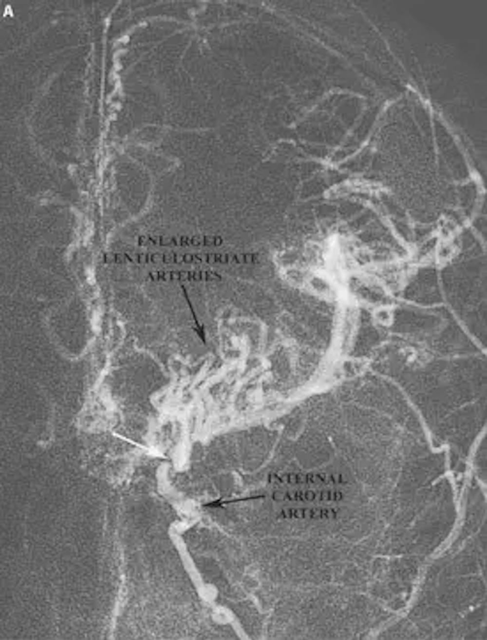 La maladie de Moya moya est typiquement rencontrée dans deux groupes de patients : 1) Les enfants de moins de dix ans et 2) Adultes dans leur troisième décennie de vie. La maladie de Moya moya chez l’enfant se manifeste typiquement par des accidents vasculaires cérébraux non hémorragiques et des crises d’épilepsie. Dans la population adulte, cependant, moya moya se manifeste plus souvent par des hémorragies cérébrales. Les anévrismes cérébraux sont également fréquents chez les patients atteints de la maladie de moya moya, et la rupture des anévrismes peut expliquer les hémorragies cérébrales chez certains patients. Une fois suspecté, le diagnostic de la maladie de moya moya est confirmé par une angiographie cérébrale. L’angiographie montre souvent une occlusion des artères carotides avec un petit réseau de vaisseaux sanguins à la base du cerveau ressemblant à une “bouffée de fumée”.