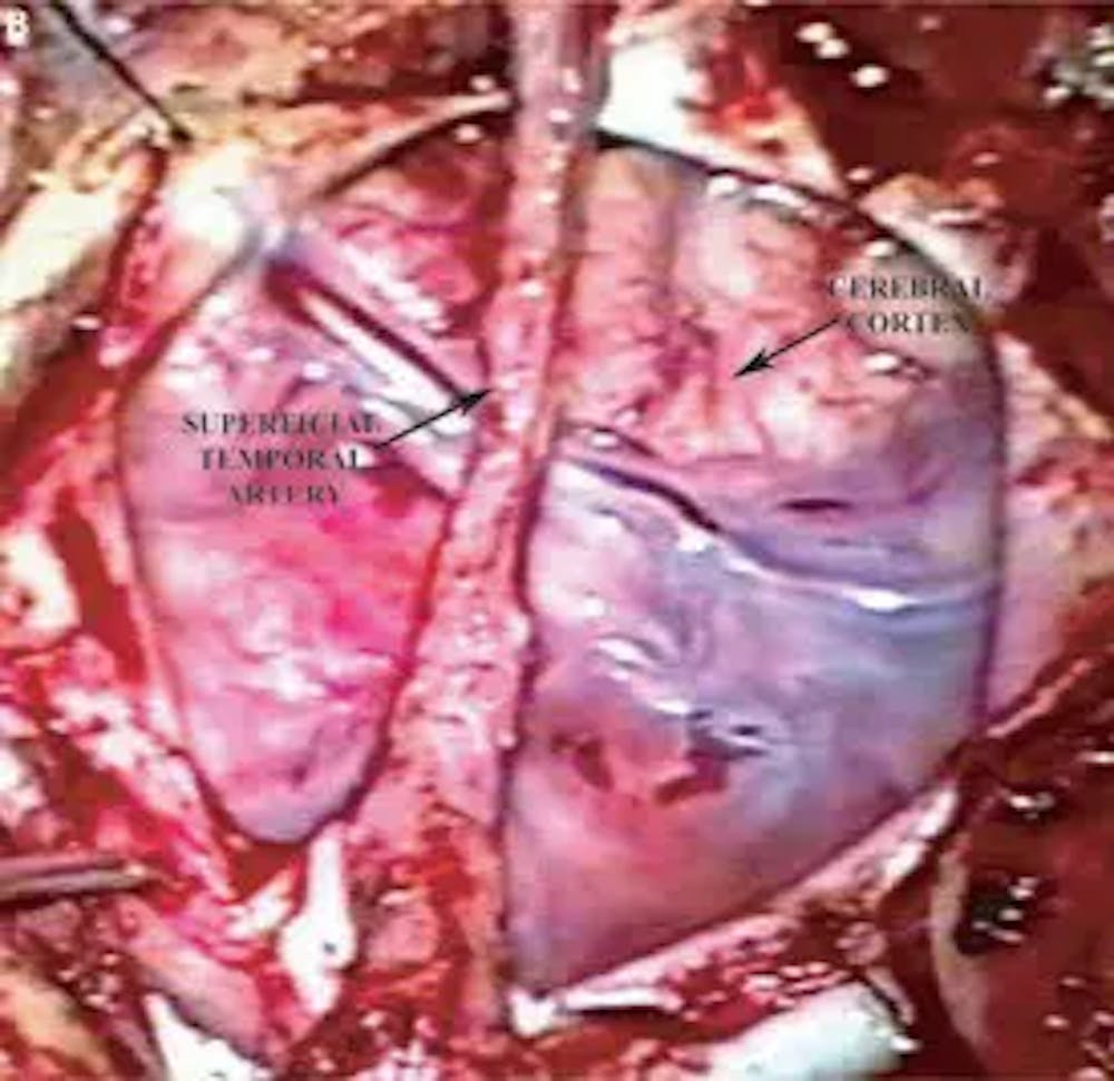 B) Photo peropératoire d’une encéphaloduroartériosynangiose (EDAS). Dans cette procédure, un pédicule vascularisé de tissu alimenté par l’artère temporale superficielle est placé à la surface du cerveau. Avec le temps, ce tissu vascularisé simulera la formation de nouveaux vaisseaux sanguins dans le cerveau.