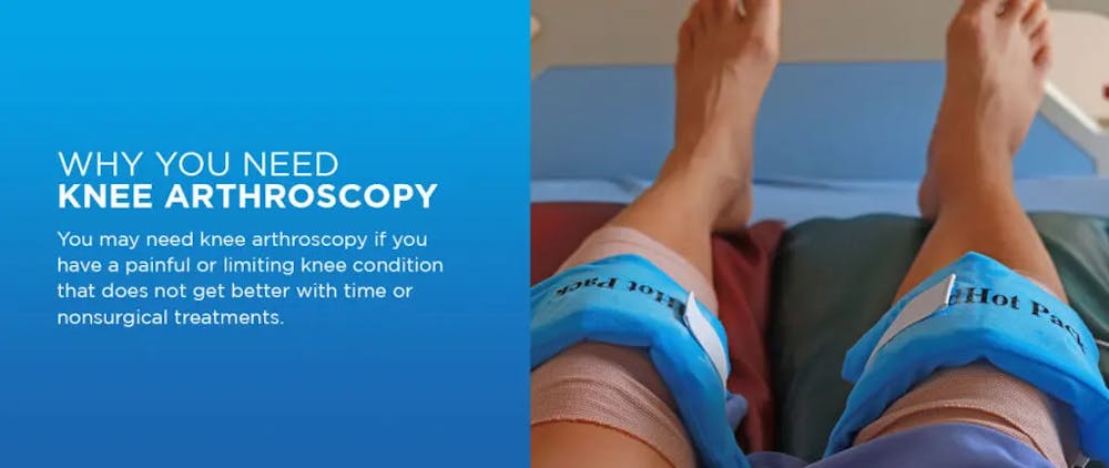 Na maioria dos casos, você pode precisar de artroscopia do joelho se tiver uma condição dolorosa ou limitante no joelho que não melhora com o tempo ou com tratamentos não cirúrgicos. Embora a artroscopia do joelho seja um tratamento seguro e eficaz, muitos médicos recomendam primeiro opções de tratamento não cirúrgico antes de considerar uma modalidade de tratamento cirúrgico. Os tratamentos não cirúrgicos populares para o joelho incluem repouso, medicamentos, fisioterapia e injeções para reduzir a dor crônica e o inchaço.