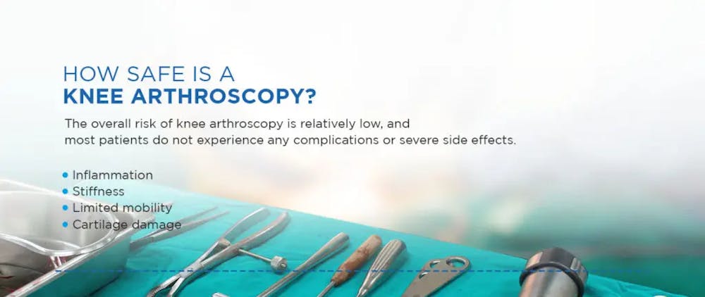 O risco geral da artroscopia do joelho é relativamente baixo, e a maioria dos pacientes não apresenta complicações ou efeitos colaterais graves. A probabilidade de complicações ou efeitos colaterais graves ou de longo prazo é muito incomum.