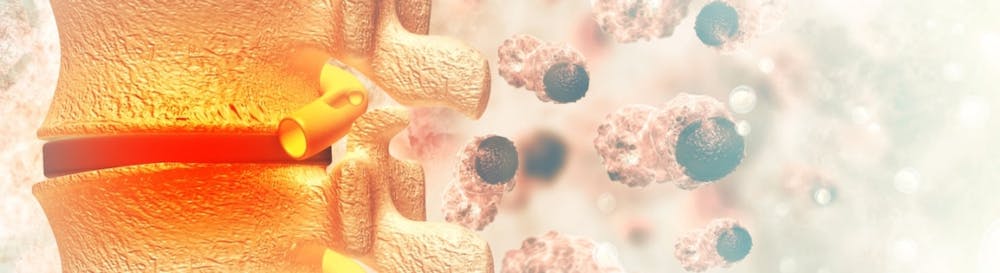 Spinal tumors arise from abnormal growths of cells in and around the spinal cord. These tumors may arise from the bones of the spinal column, the coverings of the spinal cord or even the spinal cord and nerves themselves.