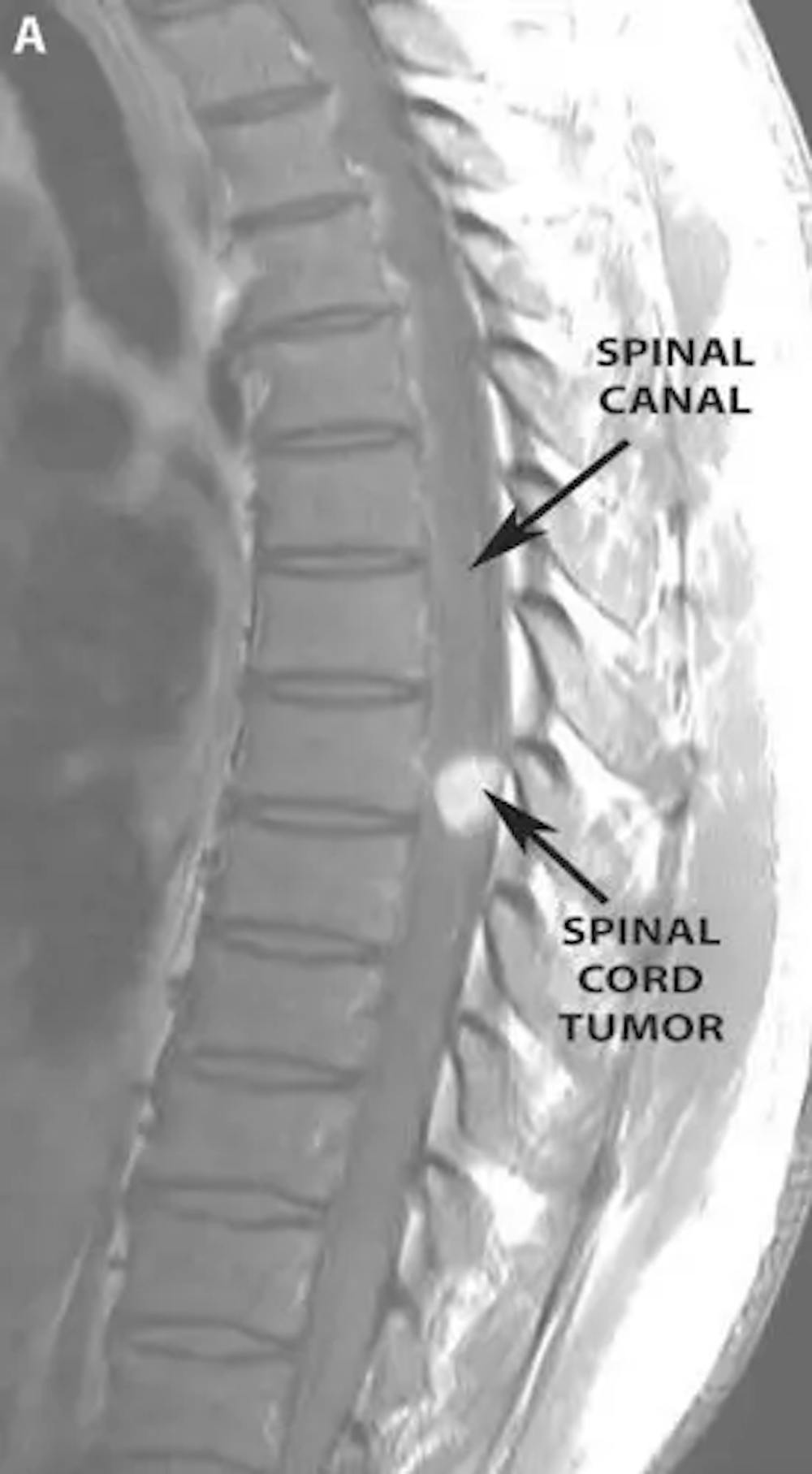 Patients with spinal tumor may exhibit a range of symptoms, including: back or neck pain, sensory loss and progressive muscle weakness affecting the arms and/or legs. An MRI or CT scan of the spine usually confirms the diagnosis and location of the tumor.