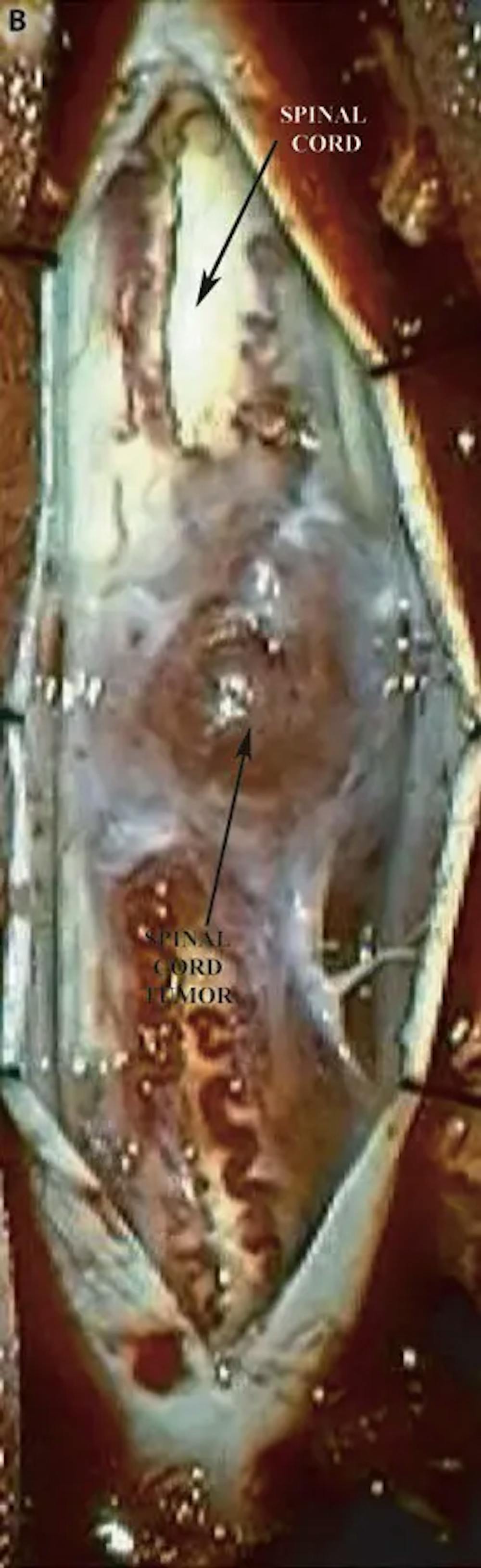 B) Intra-operative photograph demonstrating the tumor. Note how the tumor is distorting the spinal cord. In this case the tumor was a hemeangioblastoma.