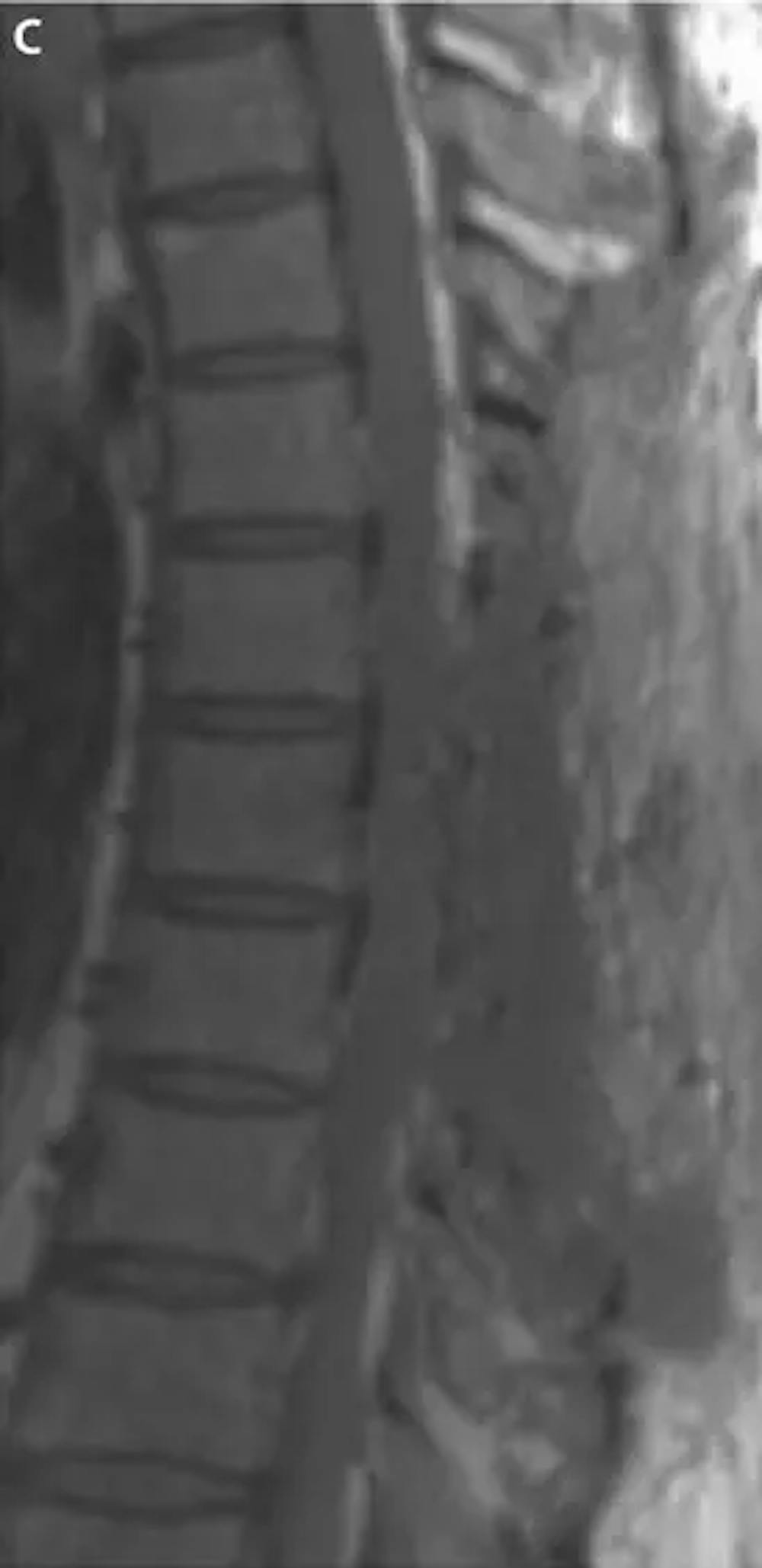 C) Post-operative sagittal MRI of the thoracic spine demonstrating complete resection of the tumor.